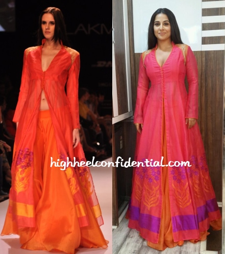 Over the weekend, Vidya and Farhan visited Dance India Dance finale to promote Shaadi Ke Side Effects to which Vidya wore a Rahul Mishra. The length difference between the kurta and the pants is what made the outfit stand out. Unfortunately, on Vidya, the look felt like any other floor-length anarkali.