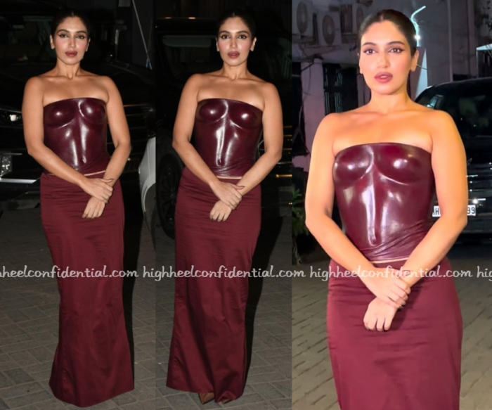 At an event on Thursday evening, Bhumi was spotted in a J Phoenix London leather bustier top and silk skirt from Anti-Thesis. You’ll remember seeing the moulded leather corset piece in a white version on Alaya a few weeks ago.