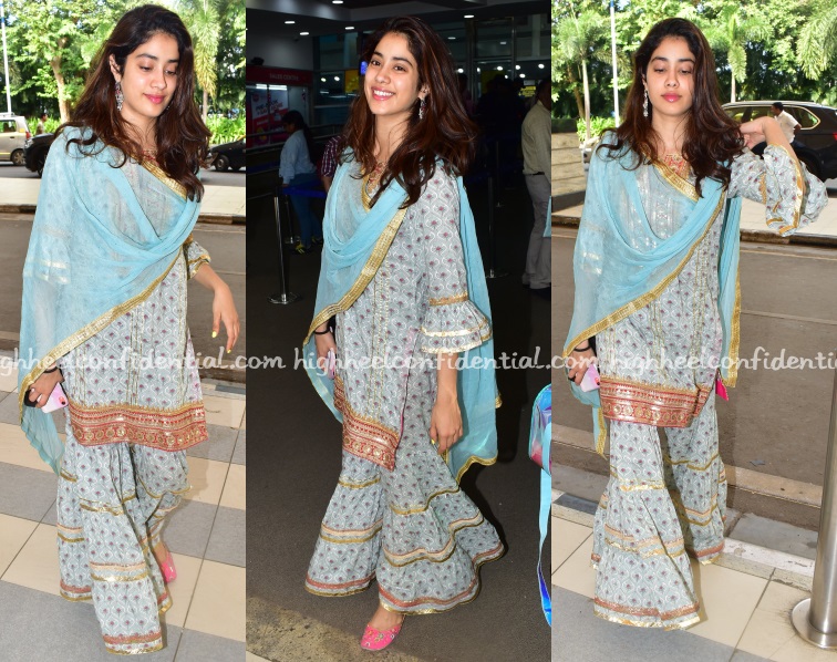 Wearing a block print sharara with jootis, Janhvi flew out of Mumbai on Thursday morning. Like the sharara suit on her?