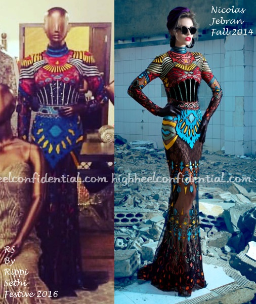 Jhanvi attended Stefano Ricci’s show in Florence recently, pics of which you’ll find inside, wearing a RS By Rippi Sethi design. The bigger deal here wasn’t Ms. Kapoor but the gown itself that seemed to borrow heavily from a gown from Lebanese designer Nicolas Jebran‘s Fall 2014 collection.