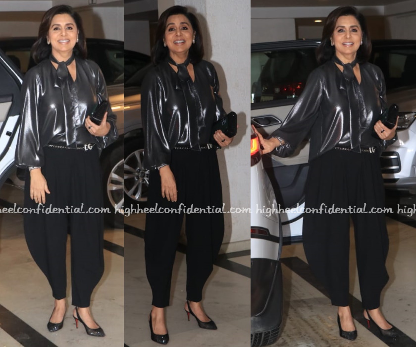 Wearing a lamé top with tapered pants, Neetu attended the success party of JugJugg Jeeyo on Saturday evening. This outfit I couldn’t get myself to like. Didn’t care for the top, the pairing of it with those pants and the addition of the belt.