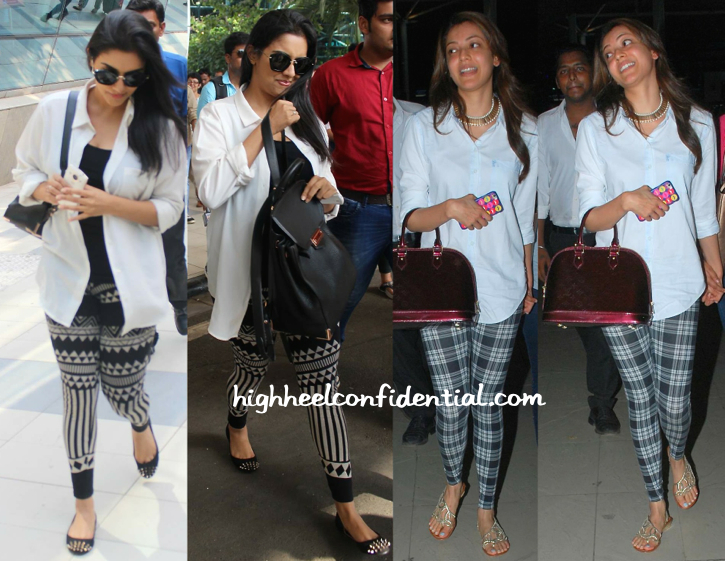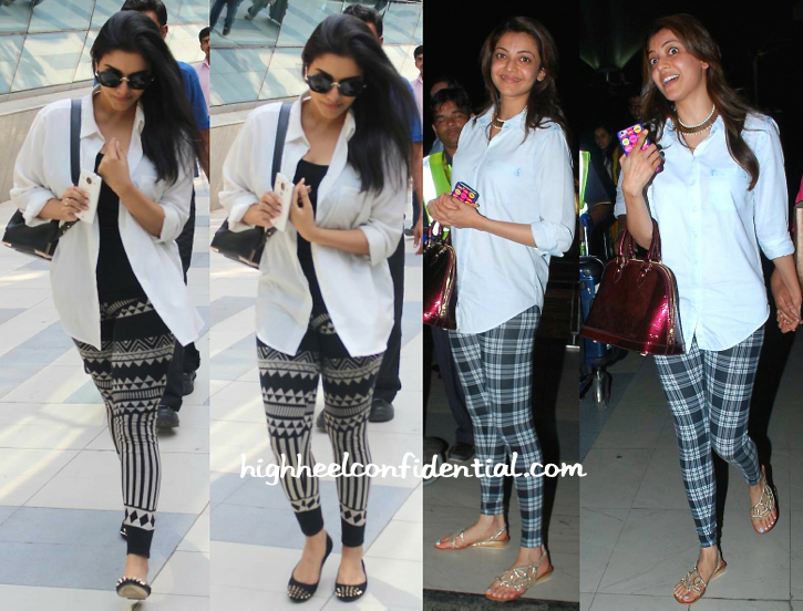 Wearing white shirts with printed leggings, both Asin and Kajal were photographed at the Mumbai airport yesterday. Which begs the question, whose travel style do you dig more?
