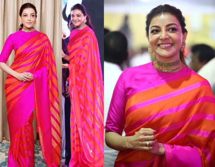 Back in March, Kajal was spotted in a pastel Raw Mango sharara. Skipping jewelry but for a lone diamond ring, the actor finished out the look with a small bindi. She looked lovely. That said, I do wish she hadn’t skipped jewelry entirely… Even with a pair of simple earrings and/or bangles, she could’ve retained that simple, fuss-free look.
