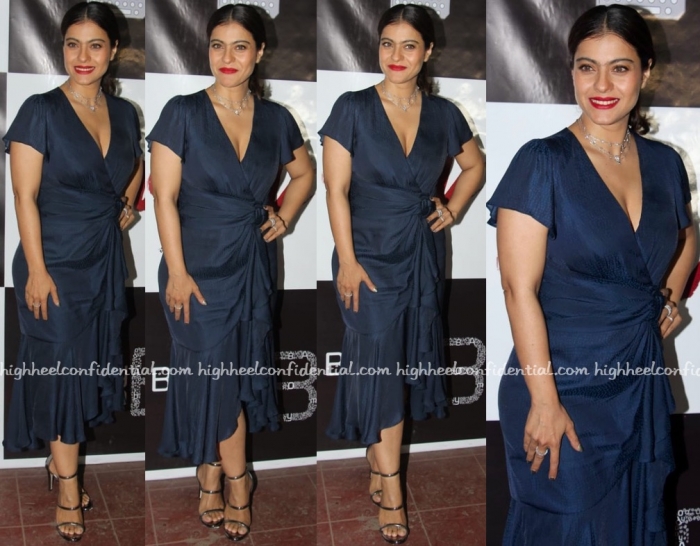 While at an event celebrating the success of her latest (short) film, Kajol was photographed in a blue faux-wrap/draped dress, one that she teamed with metallic strappy sandals (different from the ones she had on her instagram) and a striking red lip. Like what you see?
