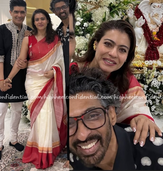 Kajol attended Pujo celebrations on Friday evening wearing a gold and subtle red bordered Gopi Vaid sari resembling the signature laal paar saris we see on Bengalis during festive season.
