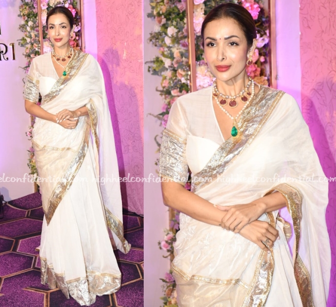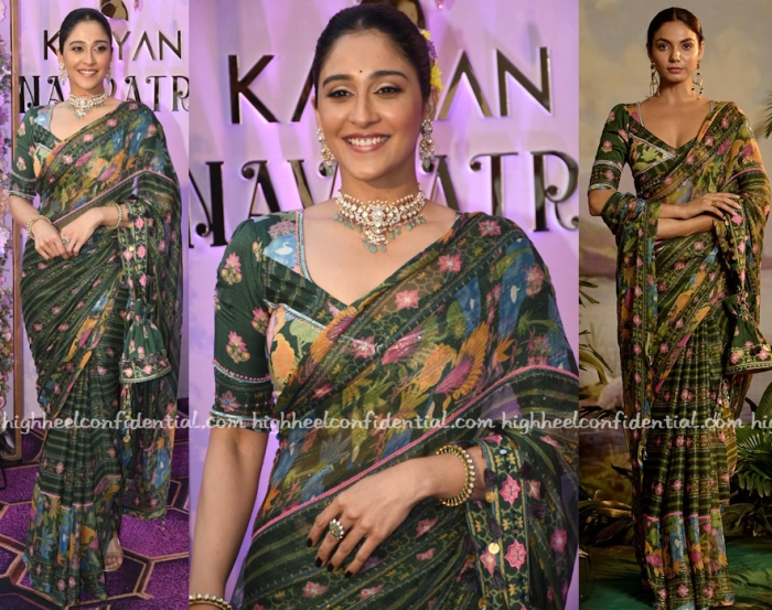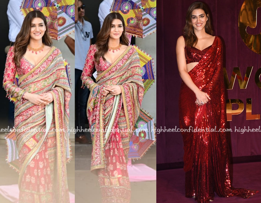 Two back to back events saw Ms. Sanon in two very different saris. She first attended a Navratri celebration in Kochi wearing a Tarun Tahliani one and then Manish Malhotra’s store launch in a signature sequin one by the latter.