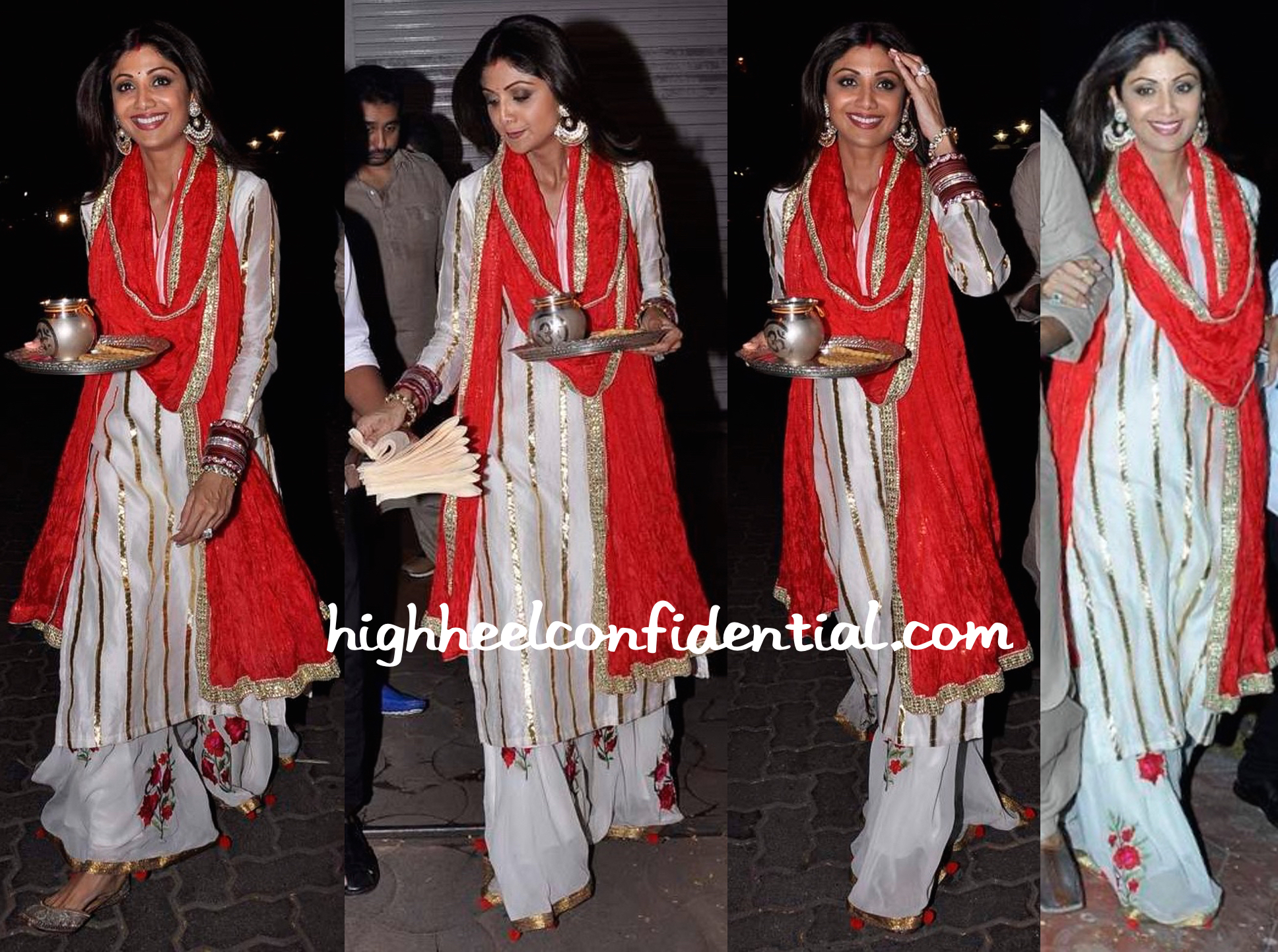 Wearing an Abu Jani Sandeep Khosla suit, Anu partook in festivities at Sunita Kapoor’s home. A matching pink bindi, sparkly pumps and a metallic Louis Vuitton clutch rounded out her look.