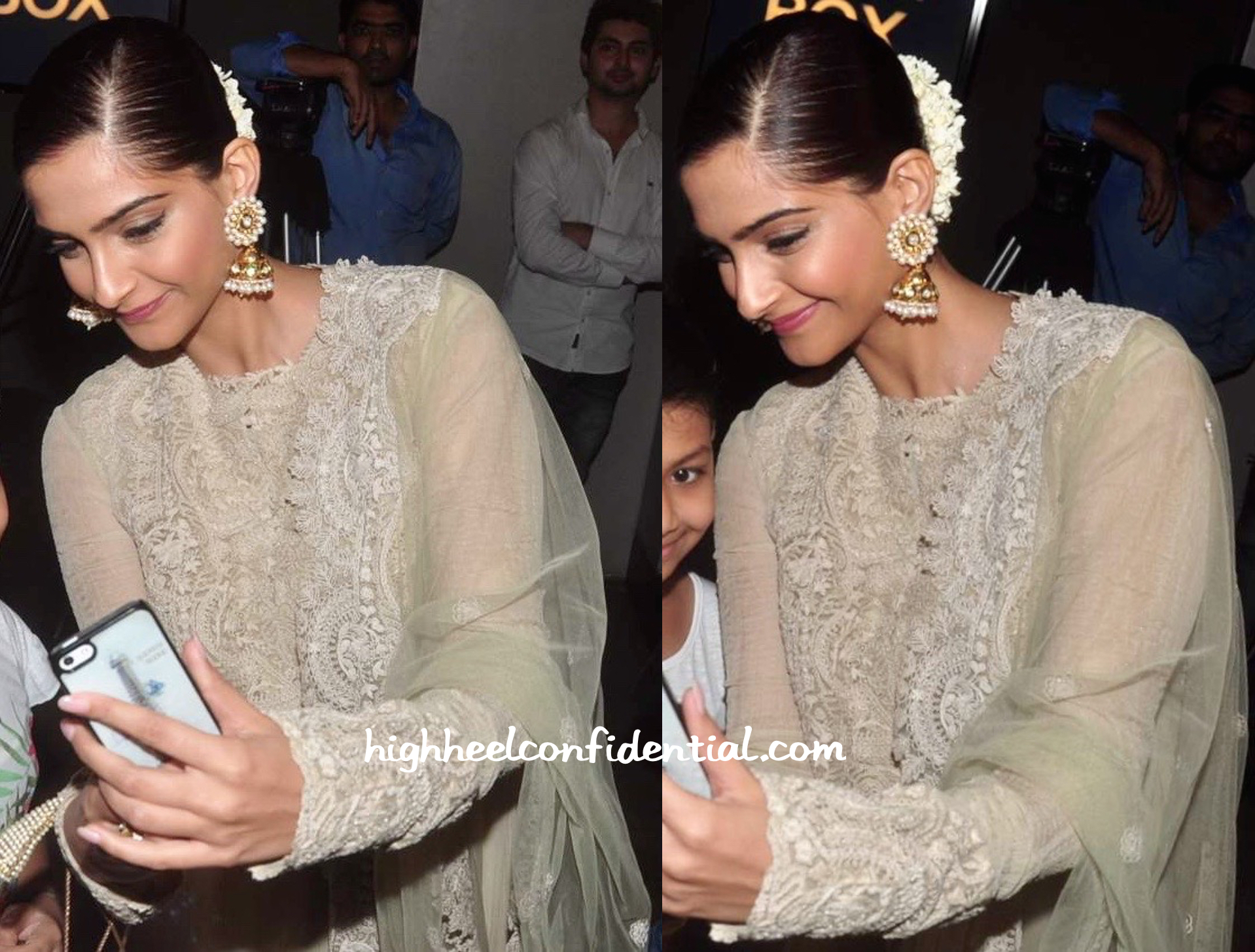 Sonam attended a recent movie screening wearing an Anamika Khanna suit. With flowers in her hair, she finished out the look with oversized jhumkis and matching potli and jootis. It’s been a while since we saw her do Indian-wear and this appearance sure made for a refreshing change; the actor looked lovely!
