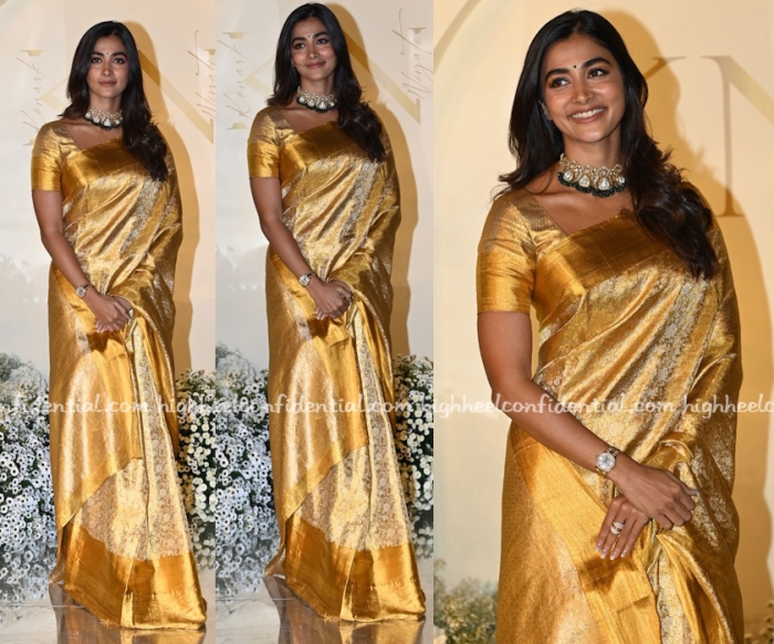 At a wedding reception, Ms. Hegde was seen in a gold kanjivaram sari paired with a heavy polki and emerald neckpiece. A regular blouse and toned down jewellery. Color me surprised and in a good way.