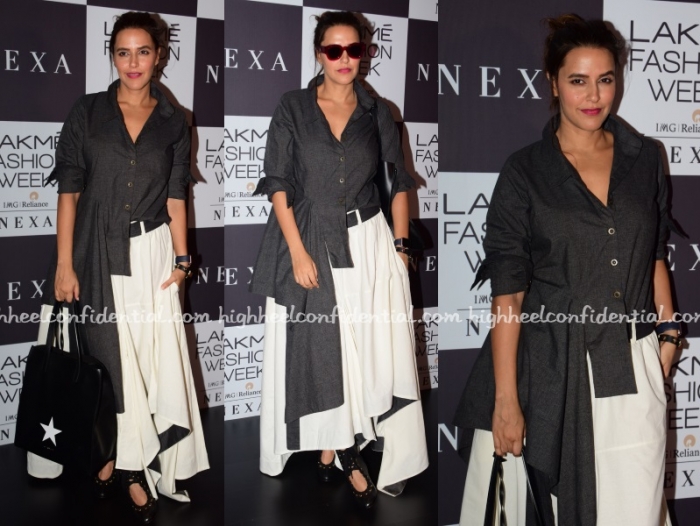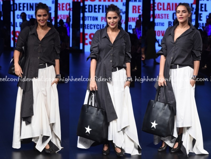 Lending her support at the Chola show was Neha wearing separates from the label with a Givenchy bag and lace-up pumps. Yes, it’s a lot of fabric and but she made it work.