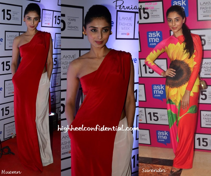 Pernia took in shows on day one of Lakme Fashion Week as always wearing outfits available on her site. She attended the morning session wearing a floral Surendri maxi switching it out for a more formal look in Huemn at the Manish Malhotra one.