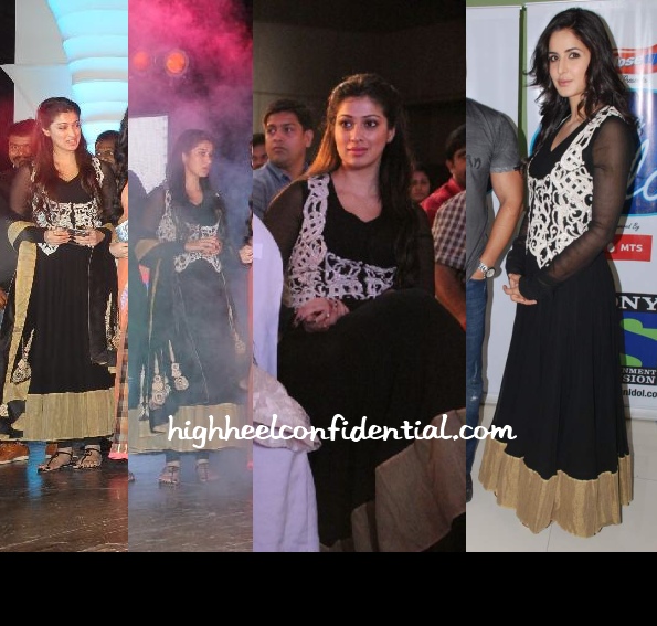 Wearing the skirt with a black top, she finished out the look with a sea shell floral necklace. I already mentioned I wasn’t a fan of the stripes/print skirt and in this case I don’t even like the necklace but Lakshmi still manages to sell me the look. Minus the necklace, weirdly I find myself liking the look on her.