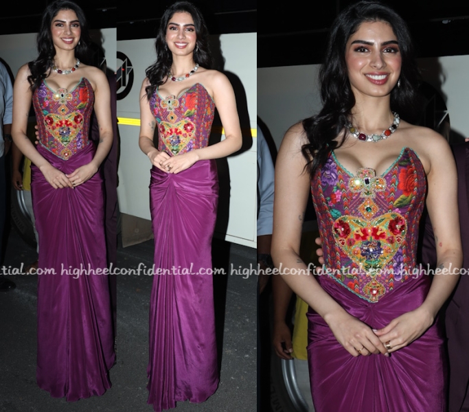 Khushi was seen at promotions on Tuesday evening wearing a heart shaped top and heart pattern skirt from Torani paired with a heart shaped bag also from the label. I get the movie is a romantic one but all the heart references was a bit overkill in my opinion.
