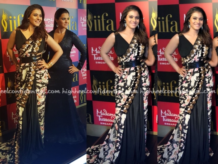 Kajol unveiled her wax figure at Madame Tussauds in Singapore on Thursday evening wearing a Shivan & Narresh printed sari. I have to admit, I wouldn’t have thought of seeing her in this fusion sari but having said that, she looked great in it! so much so, that the wax figure looked a wee bit pale in comparison. But, don’t they all next to the real thing. 😛