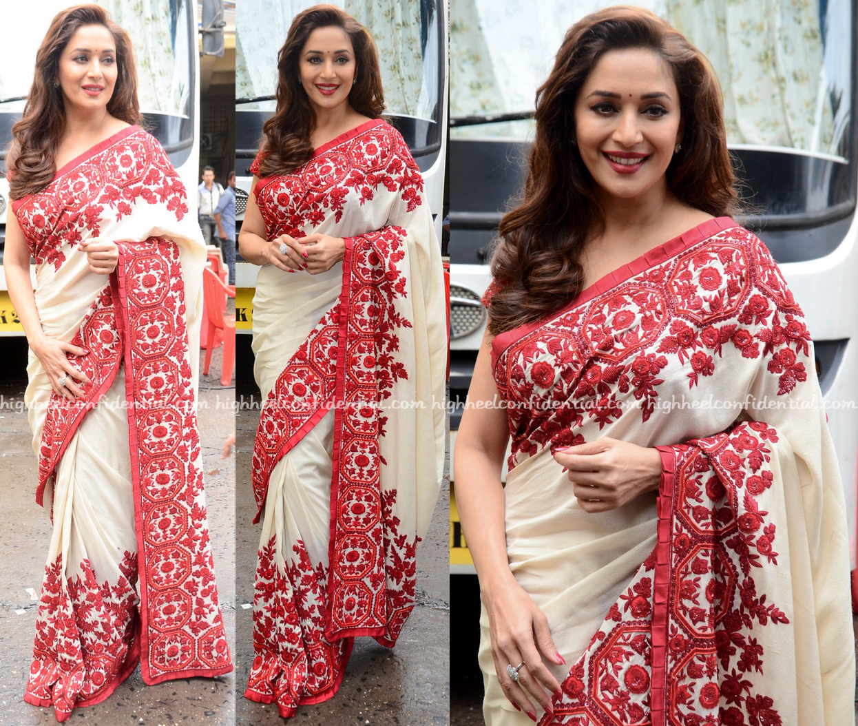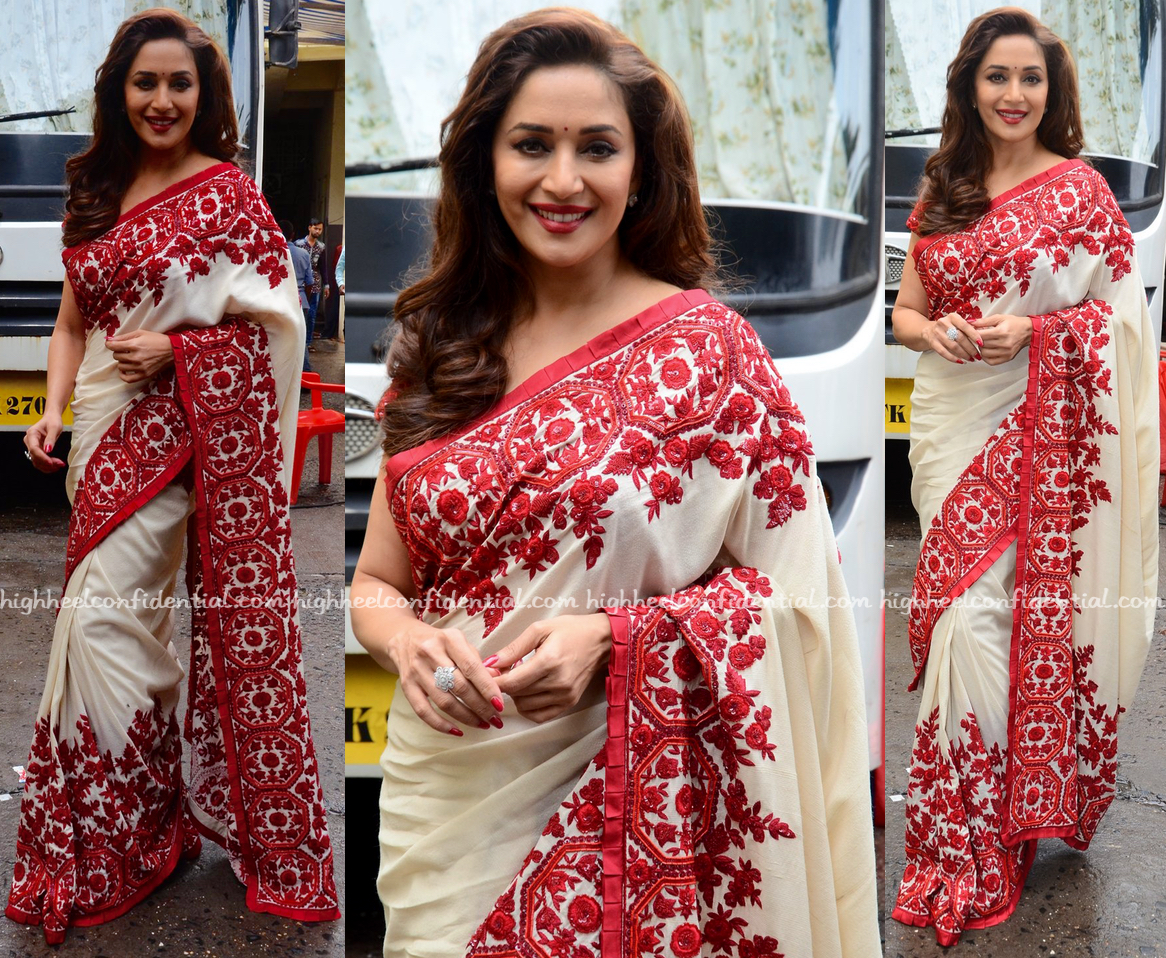 While filming on the sets of her television show, Madhuri was photographed in a Manish Malhotra sari. Wearing her hair down in signature waves, the actor finished out the look with a small bindi and lone diamond ring. Not much to fault here, she looked lovely.