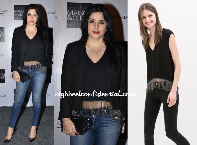 Maheep attended the Design Cell cocktail event keeping it casual (relatively) in a Zara fringe top, a cropped blazer and skinny denims.