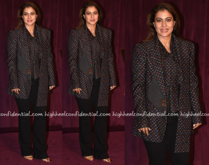 Kajol lent her support to Manish Malhotra at the launch of his store wearing a printed blazer from his diffuse line with boot cut jeans. She didn’t look bad but the jacket itself was too long on her as were the sleeves.
