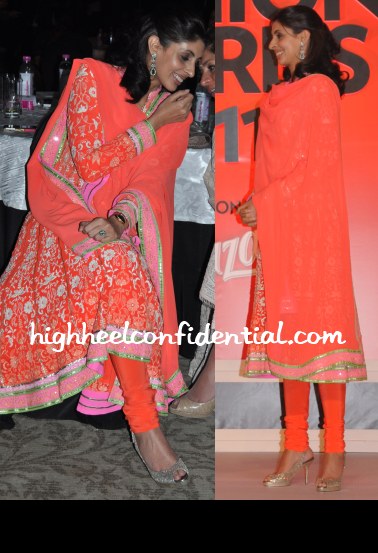 Looking vibrant in an orange Abu Jani Sandeep Khosla suit was Shweta at the Marie Claire Fashion Awards with Choo slingbacks. From what we see we quite like.