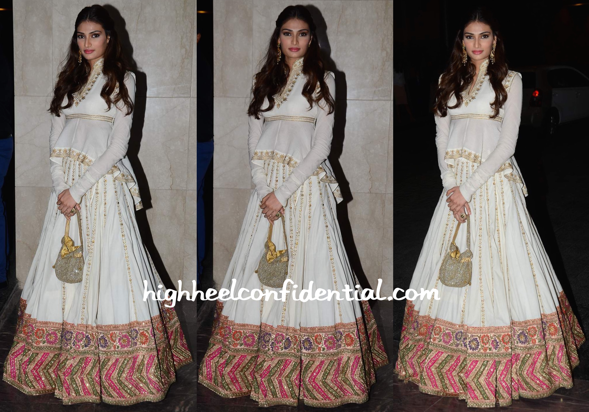At a recent soirée, spotted Athiya in a Rohit Bal lehenga. Wearing her hair partially pinned back, the actor finished out the look with big earrings, a cocktail ring and a metallic potli. Though the make-up seemed off in some images, there was no doubt that the look itself worked. Athiya wears the lehenga well!