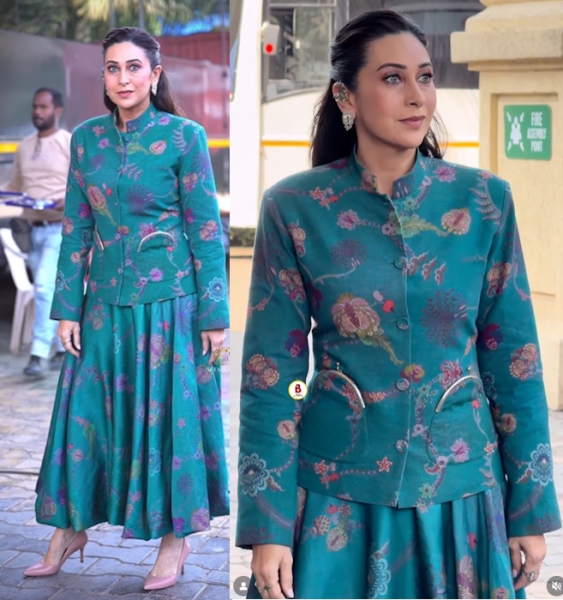 Karisma taped an episode of a reality TV on Tuesday wearing a silk shirt and draped pants set from 431-88 by Shweta Kapur paired with gold sandals and gold circle earrings. She wore it well.