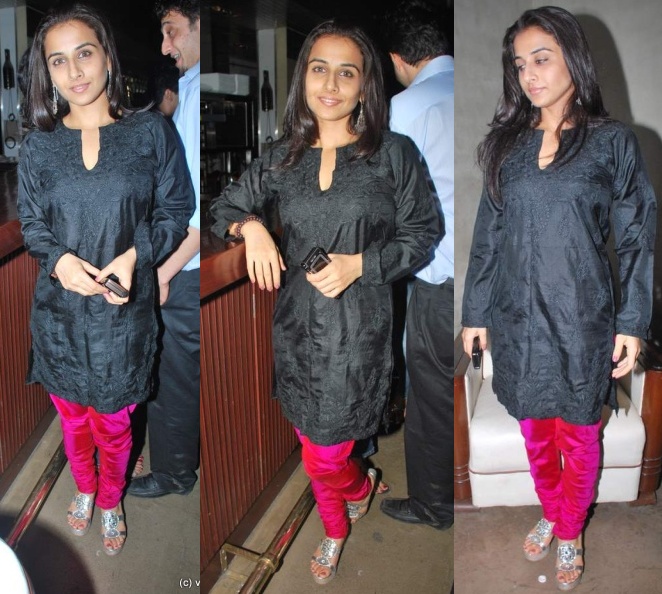 So simple a kurta and yet neither Vidya nor Adhuna managed to wear it well. Of the two, we preferred Adhuna’s all-black/red lips, but those stiff material skinny pants are what made her look not work for us. You like either or neither.