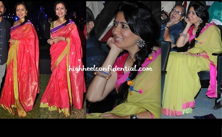 At a recent event, spotted Mandira in a Raw Mango sari… You may recall seeing the sari in white on Mini a couple of months ago. Are you inclined to prefer one more over the other?
