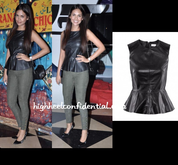 A make-up free Esha attended the LSTCK screening wearing a leather Zara peplum top with grey button leggings, a chain bag and pumps. She looked great and we, of course, were envious!