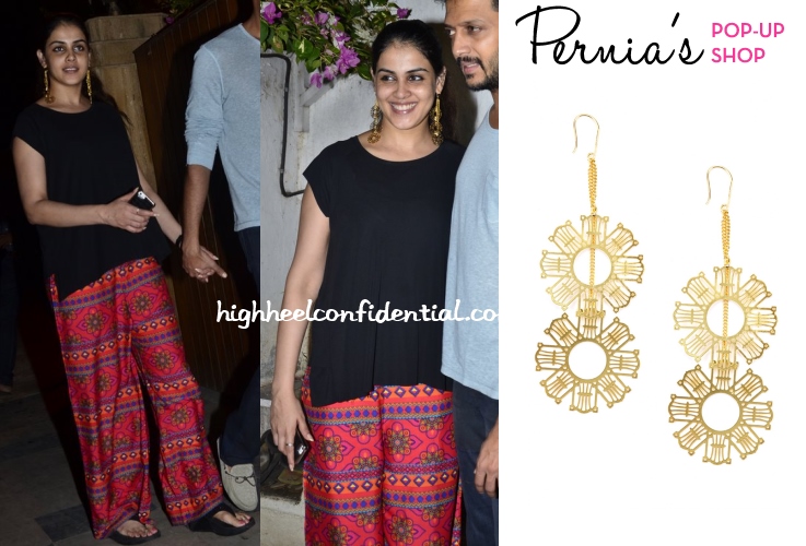 Genelia and Ritesh attended a bash to celebrate the success of his movie to which she wore a black top and printed red pants with a pair of Mrinalini Chandra earrings.