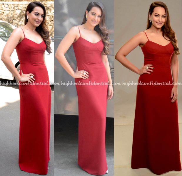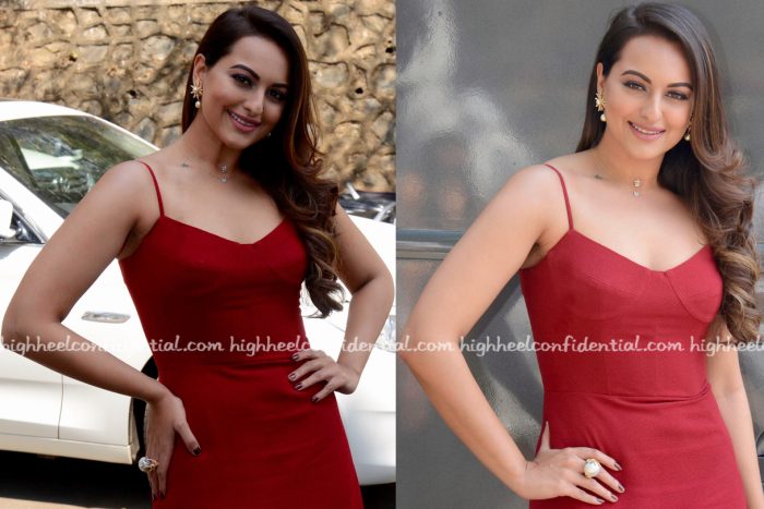 At the taping of Nach Baliye on Tuesday, Malaika was seen in a beige off-shoulder dress from Lebanese label, Rayane Bacha. Hair in a sleek ponytail, her look was finished out with tassel earrings from Bija Jewels and Louboutins that subtly matched her dress.