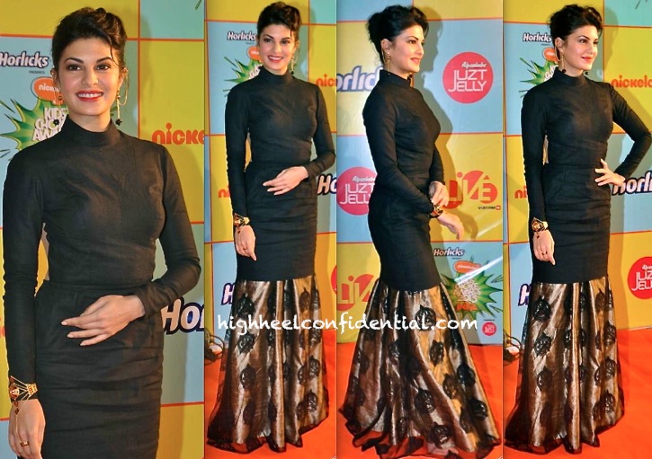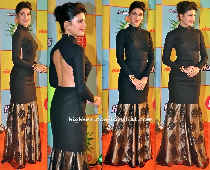 Recent few sightings of Deepika’s have been just a tad lacking but with this appearance of hers, she redeems herself. Deepika looked great at the Nickelodeon Awards in her black midi dress and Quirk Box jacket. An updo, sun-kissed makeup, statement necklace (by Mehak Gupta) and straight-up lustworthy pumps finished out her look. We like.