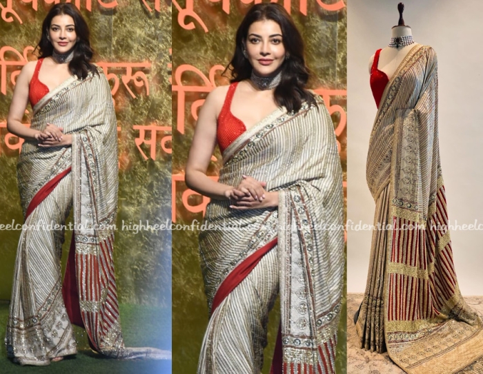 Kajal opted for a Nidhi Tambi Kejriwal sari to wear to the Ambani Ganesh Chaturthi celebrations. That has got to be a very heavy sari considering those lines are not sequins but actual embroidery. Having said that given the sari was so rich wish the the blouse matched the richness as well. It looked like it was made out of inexpensive material.
