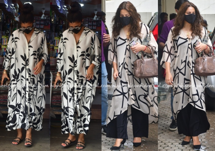 While out and about, Nimrat was photographed wearing an easy floral-printed dress twice in a span of couple weeks. Gold-toned jewelry, brown suede tote and Nicholas Kirkwood flats rounded out her look both times. You won’t hear us complain, we love to see outfits being repeated around here!