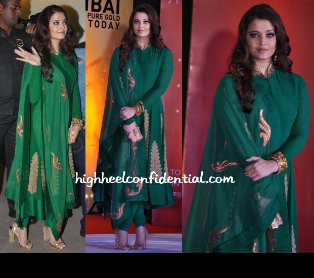 It was a busy Sunday for Aishwarya, who first inaugurated Kalyan Jewellers store in a Gaurav Gupta then switched into an emerald green Nupur Kanoi suit for the press conference.