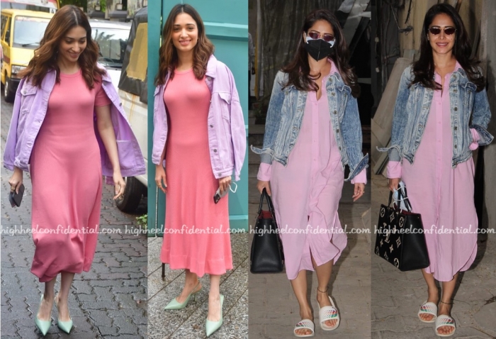 For their recent outings both Tamannaa and Nushrat teamed their pink-toned midi dresses with denim jackets. But while the former dressed hers up with a pair of slingbacks, the latter took a decidedly more casual approach with her slides and roomy Louis Vuitton tote.