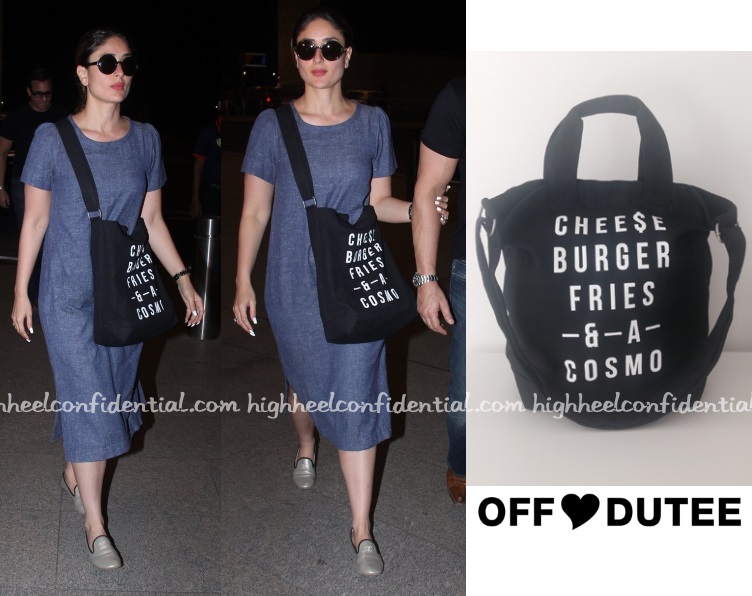 Wearing a relaxed denim dress from Shift by Nimish Shah with grey Chanel smoking flats, Kareena jetted out of Mumbai on Wednesday evening. The look quite striking because of her cheeky Off Dutee crossbody bag.