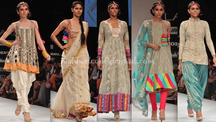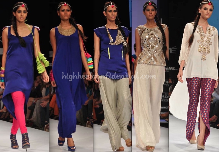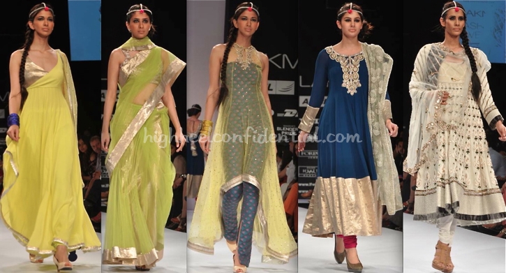Taking a break from her heavily embellished designs and the emphasis on jeweled necklines, Payal Singhal presented a collection that was somewhat of a departure from her usual. Somewhat. The embellishment was still there but seemed relatively more restrained than in the past. Besides her favored colors that we’ve come to expect in her collections, the saturated indigo was a welcome addition to the color palette.