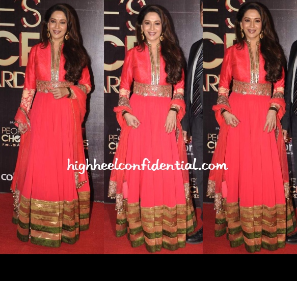 Madhuri went with a pink Manish Malhotra long anarkali at the People’s Choice Awards. I wish she’s gone for a different Manish Malhotra outfit because between the pink and the big olive green striped border, the anarkali felt overwhelming on her.