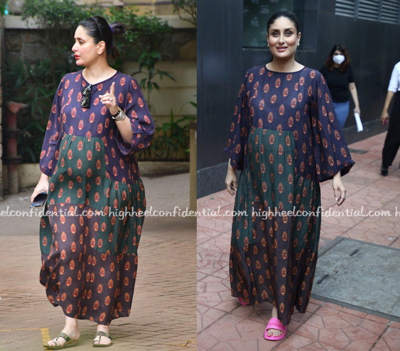 Giving her Pinnacle by Shruti Sancheti maxi another outing was Kareena, seen today wearing the patchwork maxi with green kolhapuris and a hairband. We sure like!