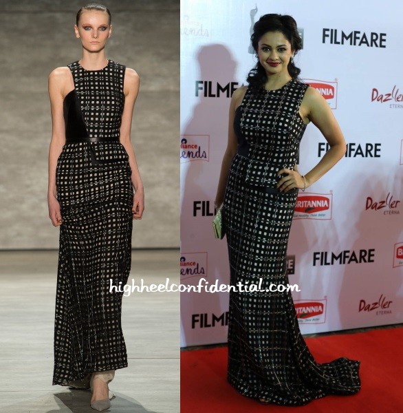 Pooja attended day one of SIIMA wearing a Rehane mirror-work sari and a matching blouse. Better draping and I might have liked this look but as is, not feeling a whole lot of love for it. Also, I can’t figure out if that is a random necklace tucked on the side or part of the original sari design. Either way, it doesn’t seem to add much to the look.