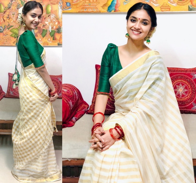 Keerthy attended SIIMA in Dubai on Saturday evening wearing a gold sari by Poornima Indrajith complete with mogra in her hair. The sari was pretty and Ms. Suresh looked nice but the blouse design wasn’t really my cup of tea.