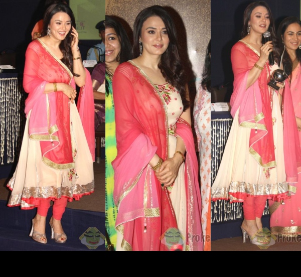 Before heading up on stage on the sets of a television show, Preity changed out from her nude wedges in to pumps and left behind her tan Kelly. A switch that didn’t make much of a difference given the outfit itself. Maybe the fact that it was a kids show had something to do with Ms. Zinta doing all that pink but really now, it was a bad call!