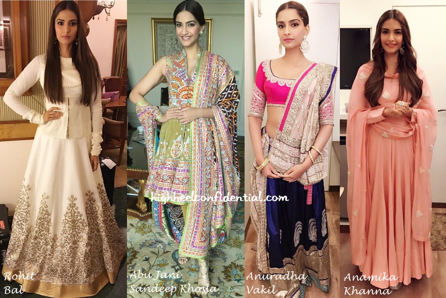 Sonam sported a few more desi looks this week for promotions of Prem Ratan Dhan Payo with two looks being very ornate and two relatively simple.