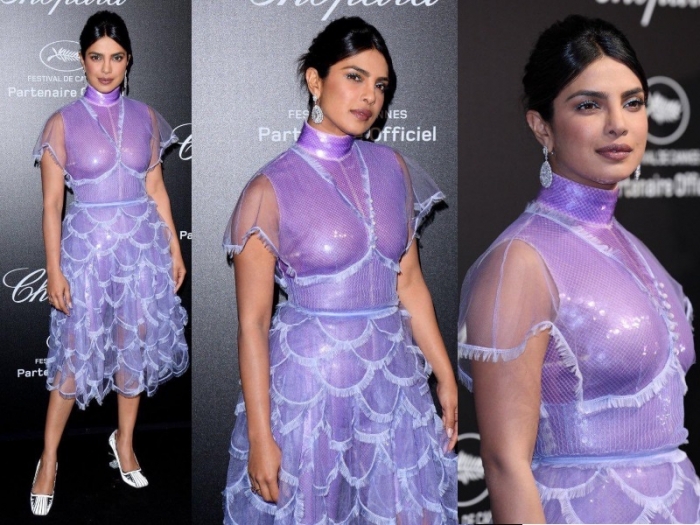 Wearing a Fendi dress from the Fall 2018 couture collection, Priyanka attended the Chopard Love Dinner on Friday evening at Cannes. Besides the color, there really wasn’t much to like here. The pumps felt too heavy and the piping along the middle and under the bust made the already busy dress busier.