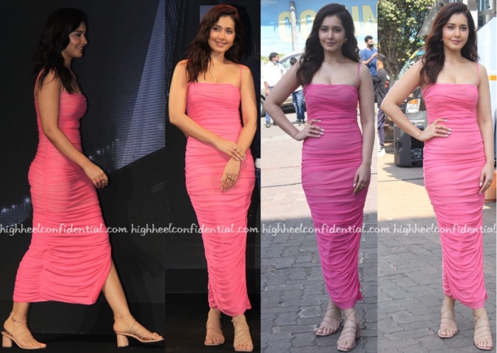 Wearing a ruched body-con dress with nude strappy sandals, Raashi attended the trailer launch of her upcoming movie. Not a fan of the dress itself but Raashi to her credit made it work for her.