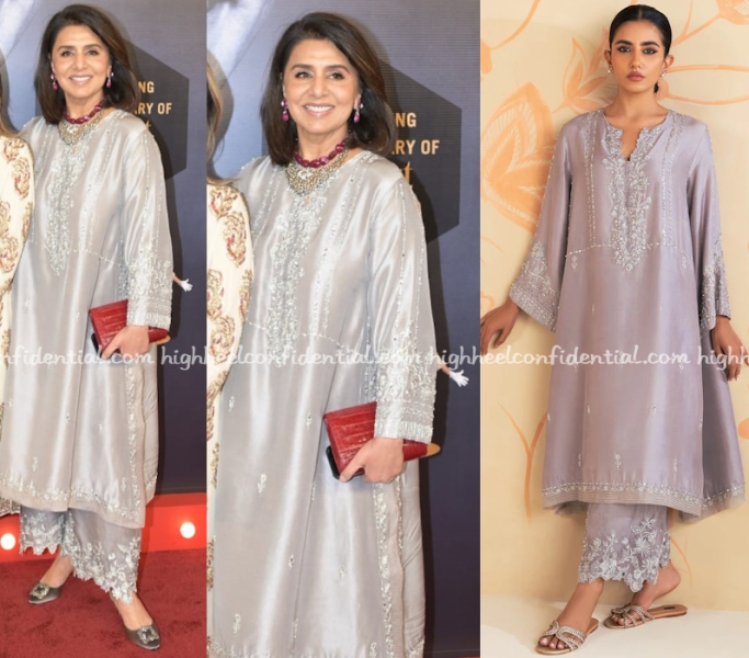 Rekha and Ms. Razdan wore cream and gold toned saris to the Raj Kapoor centenary event with the former in an embellished Kanji and the latter in a Benarasi. Rekha being her, of course, wore her dressed to the nines while Ms. Razdan kept it more simple. They both looked lovely.