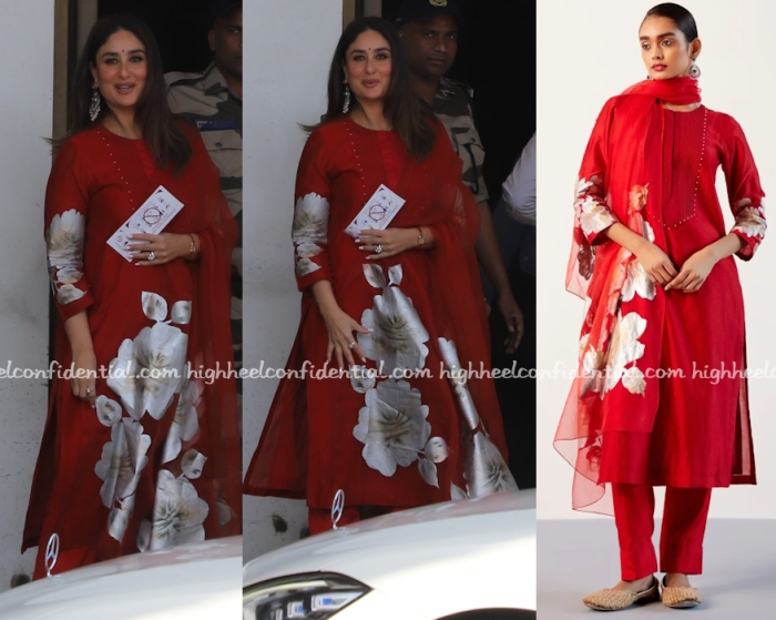Wearing a red Chanderi suit from Devnaagri, Kareena was seen on her way to Delhi as part of the Kapoor delegate’s visit to the PM to invite him for the Raj Kapoor Centenary celebrations. Like the suit?
