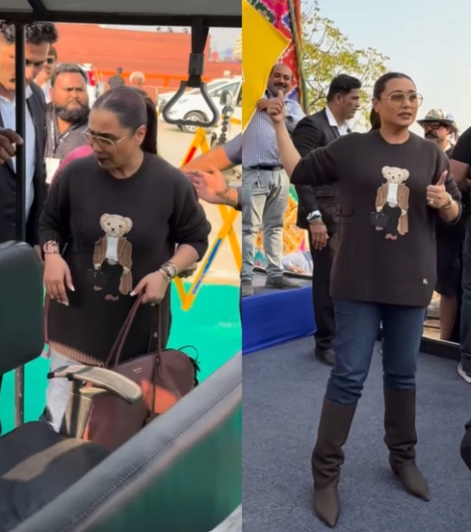 Rani kicked off her upcoming movie’s promotions in Ahmedabad wearing a Ralph Lauren bear sweater with skinny denims and brown boots. Catch her other bear embroidered bear sweater here.