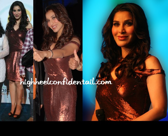 While most of us were partying on NYE, some folks were busy working, one of them being Sophie who performed at the Country Club in Dubai. For the press meet of the bash which happened a day earlier, Sophie wore a copper Rohit Gandhi + Rahul Khanna sequin dress paired with what looked like matching copper-toned slingbacks.
