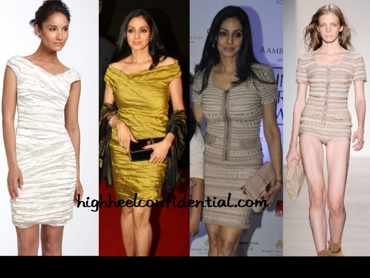 Spotted wearing dresses at two back-to-back events, Sridevi gave us one hit and one miss. The Léger dress was just so meh color wise and design wise and the matching accessories didn’t liven the look instead made it more dull.