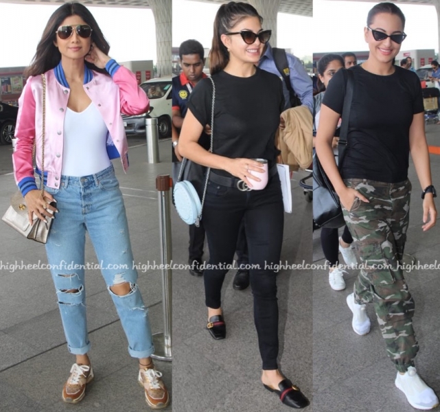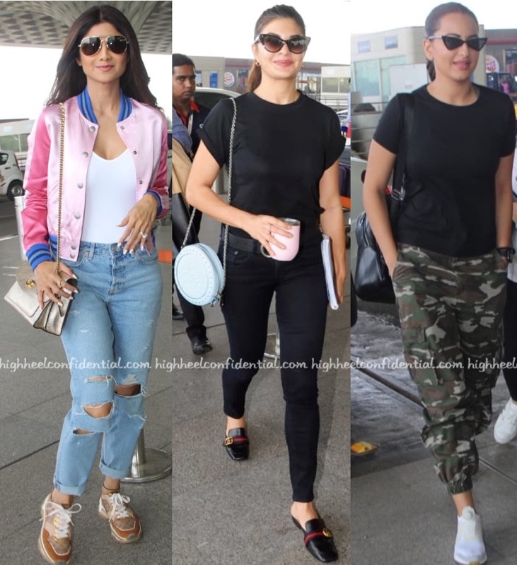 Shilpa, Jacqueline and Sonakshi were photographed heading in to the airport in Mumbai yesterday. Though they all kept their look casual (some more than others) for travel, it has to be asked… Whose style comes closest to your own when traveling?